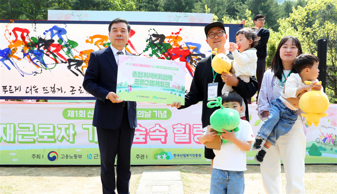 | ▲근로복지공단 박종길 이사장(좌측)이 제1회 산재근로자의 날을 기념해 4월 29일에서 30일까지 국립춘천숲체원에서 산재근로자와 가족들을 위한 산림치유 프로그램을 개최했다.(근로복지공단 제공) |