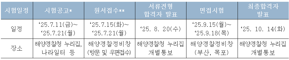 응시원서 접수는 7월 15일부터 21일까지 7일간 진행되며, 채용 공고문은 해양경찰청 누리집과 해양경찰정비창 누리집, 그리고 나라일터에 게시되어 있다. 채용 절차를 거친 최종합격자는 오는 10월 중 발표될 예정이다.