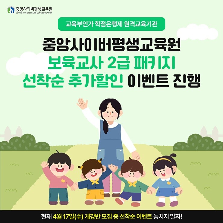 교육부인가 학점은행제 원격교육기관인 중앙사이버평생교육원에서는 보육교사 2급 및 장애영유아보육교사 자격증 취득 과정을 개설하고 선착순 추가 할인 이벤트를 진행한다.