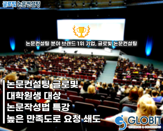 논문컨설팅 8년연속 브랜드 1위 기업 ‘글로빛(GLOBIT)’은 논문작성에 어려움을 겪고 있는 고객들을 위해 체계적인 논문컨설팅을 실시하였으며 경상국립대, 강원대, 고려대, 경희대, 동국대, 단국대, 목포해양대, 부산대, 서울시립대, 성균관대, 성신여대, 전남대, 중앙대, 한양대, 한국외대, 한성대, 홍익대 등 대학원생과 교수 대상 석사논문, 박사논문, 학술지 등 한글 논문 작성법과 표절, 연구윤리 등 활발한 논문 특강과 논문컨설팅을 개최하여 좋은 반응을 얻어왔었다.