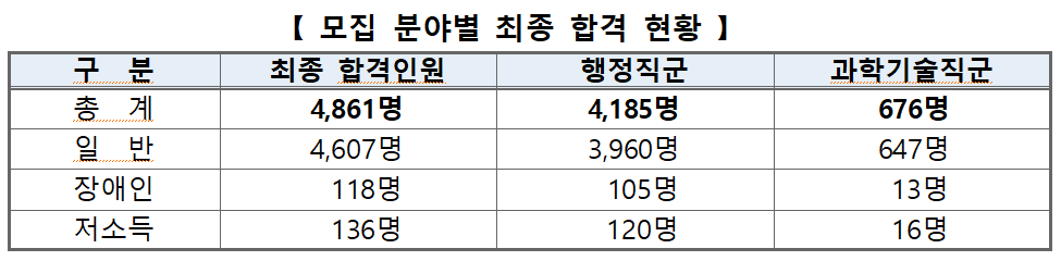 이번 채용시험의 필기시험은 지난 3월 23일에 치러졌으며, 6,237명이 필기시험에 합격했다. 이후, 지난달 29일부터 이달 3일까지 총 6일간 진행된 면접시험을 통해 최종 4,861명이 합격자로 선정되었다.