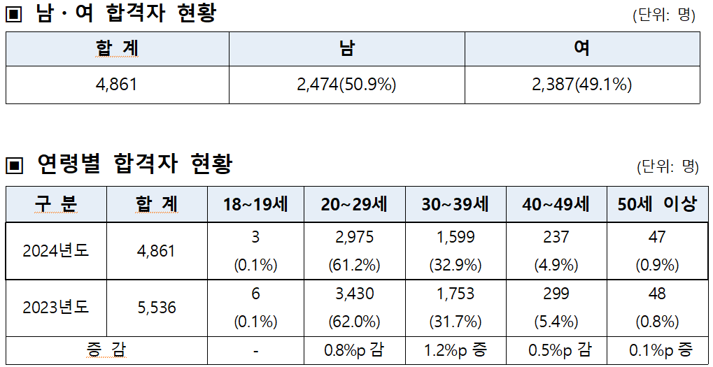 최종합격자 중 여성은 2,387명(49.1%), 남성은 2,474명(50.9%)으로 나타났다.