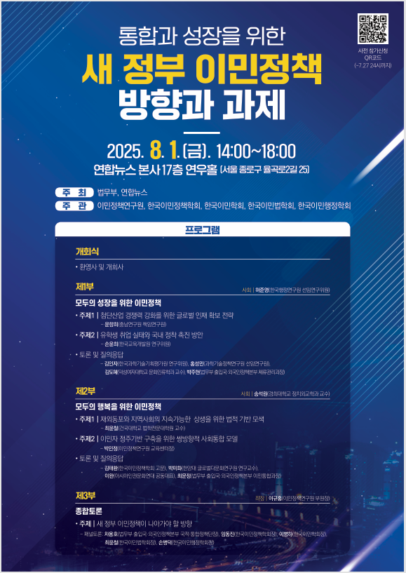 법무부는 8월 1일 오후 2시 서울 연합뉴스 본사 연우홀에서 ‘통합과 성장을 위한 새 정부 이민정책 방향과 과제’를 주제로 이민정책포럼을 개최했다. 이번 포럼은 법무부와 연합뉴스가 공동 주최하고, 이민정책연구원과 한국이민정책학회, 한국이민학회, 한국이민법학회, 한국이민행정학회 등 4대 학회가 공동 주관했다.