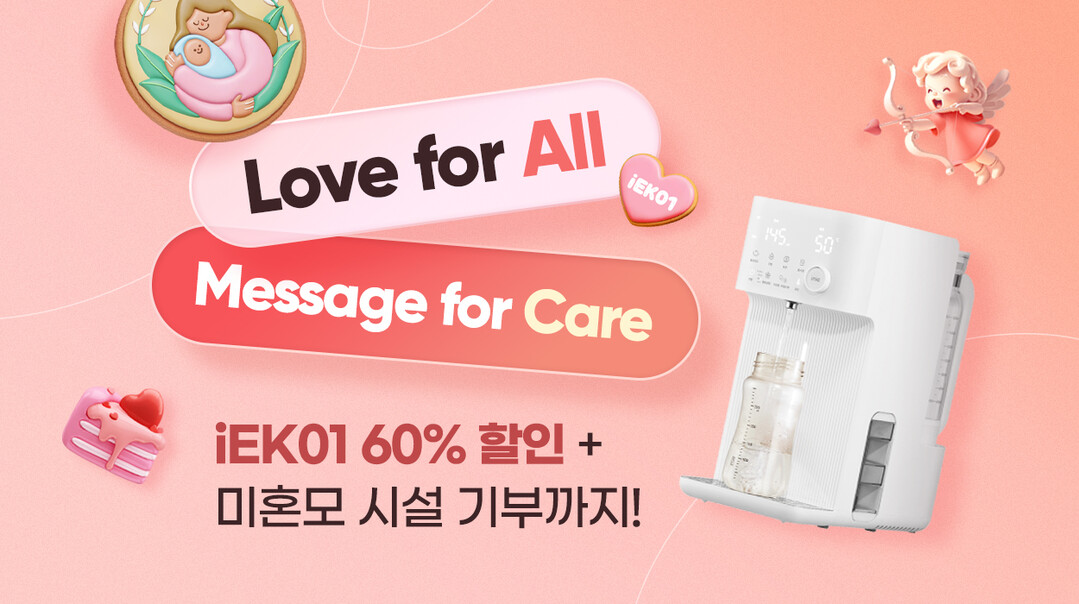 ‘러브 포 올, 메시지 포 케어’ 프로모션에서 아이닉 올케어 분유포트 ‘iEK01’이 59% 할인가로 판매된다. 결제 단계의 ‘기부 메시지 작성’란에 모든 엄마와 아기를 위한 메시지를 쓰면 한 건당 1000원씩 적립되며, 모금액만큼 iEK01을 구매해 복지시설에 전달한다.