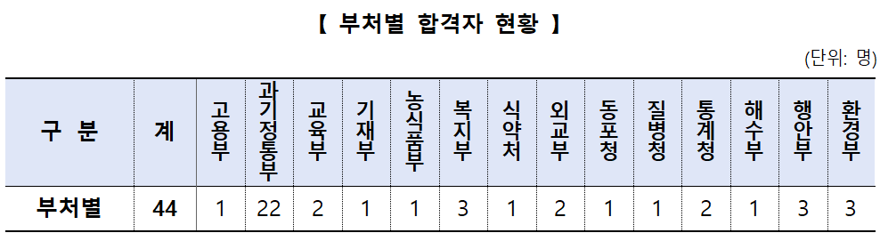 이번 시험에서는 행정·고용노동·교육·전산·보건 등 다양한 분야에서 총 44명이 최종 선발됐다. 직급별로는 7급 1명, 8급 3명, 9급 40명으로, 대부분이 9급에서 채용됐다. 이들은 고용노동부, 과학기술정보통신부, 교육부, 보건복지부, 행정안전부 등 14개 중앙행정기관에 배치될 예정이다.
