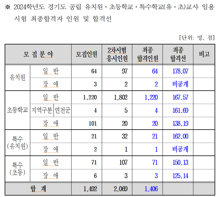 경기도교육청(교육감 임태희)은 ‘2024학년도 경기도 유치원‧초등학교‧특수학교(유‧초) 교사 임용후보자 선정경쟁시험’ 최종합격자를 지난 2일 발표했다.