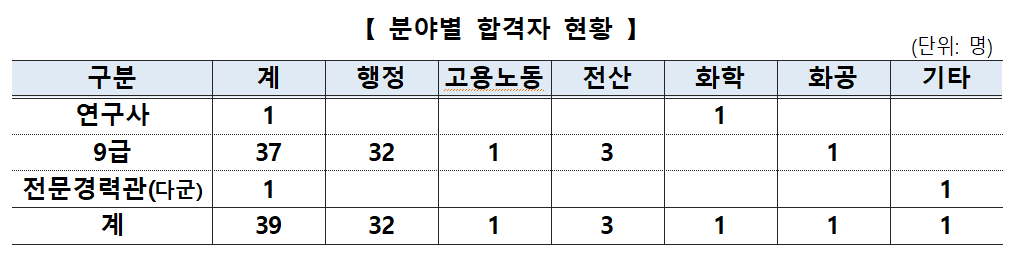 올해 시험에서 행정, 고용노동, 전산, 화학, 화공 등 분야에서 연구사 1명, 9급 37명, 전문경력관(다군) 1명이 최종 합격했다.