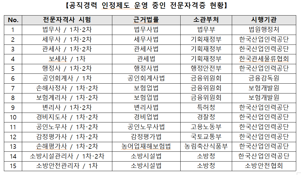 현재 자격 자동부여나 시험과목 면제 등 특례규정이 반영된 개별법상 국가전문자격시험(15종)에 대한 공직경력인정 특례를 폐지한다. ▲법무사 ▲세무사 ▲관세사 ▲행정사 ▲변리사 ▲공인회계사 ▲공인노무사 ▲소방시설관리사 ▲경비지도사 ▲감정평가사 ▲손해평가사 ▲손해사정사 ▲보험계리사 ▲보세사 ▲소방안전관리자 등 15종이다.