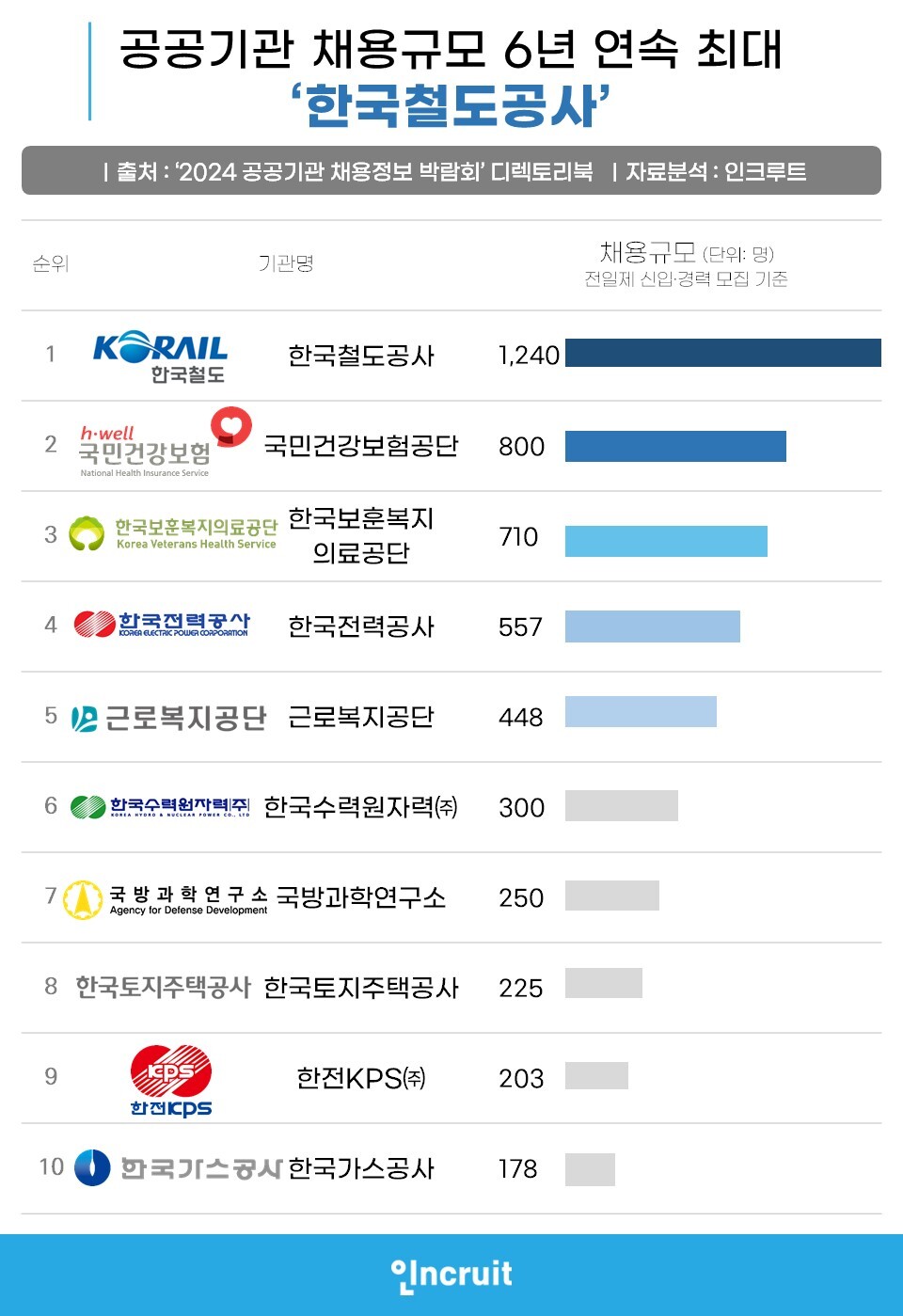 올해 채용규모가 가장 큰 공공기관은 한국철도공사로 사무와 기술 직무에서 1,240명을 채용한다. ▲2022년 1,400명, ▲2023년 1,440명에 비해 채용 수는 줄었으나 6년 연속 가장 큰 채용 규모다.