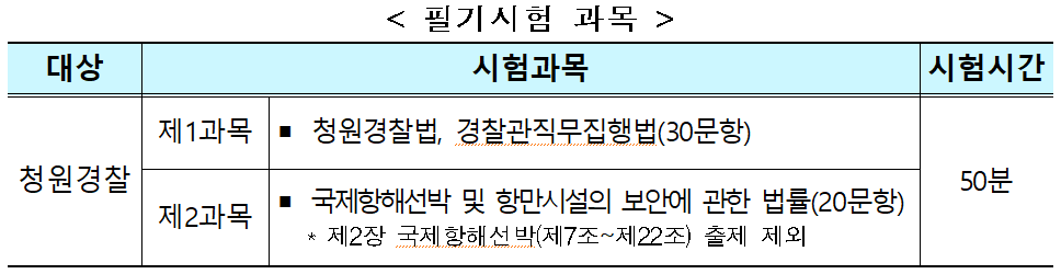 3차 필기시험은 제1과목 ‘청원경찰법과 경찰관직무집행법’ 30문항, 제2과목 ‘국제항해선박 및 항만시설보안에 관한 법률’ 20문항을 50분 동안 실시한다.
