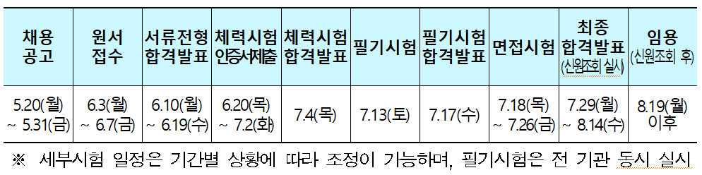원서 접수는 소속기관별로 6월 3일부터 7일까지 진행되며, 서류전형 합격자는 6월 10일부터 19일까지 발표한다. 체력시험 합격 발표는 7월 4일, 필기시험은 7월 13일에 실시한다.