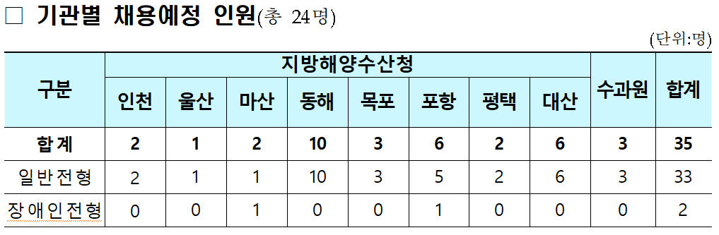 이번 채용은 인천청 2명, 울산청 1명, 마산청 2명, 동해청 10명, 목포청 3명, 포항청 6명, 평택청 2명, 대산청 6명, 국립수산과학원 3명이다.