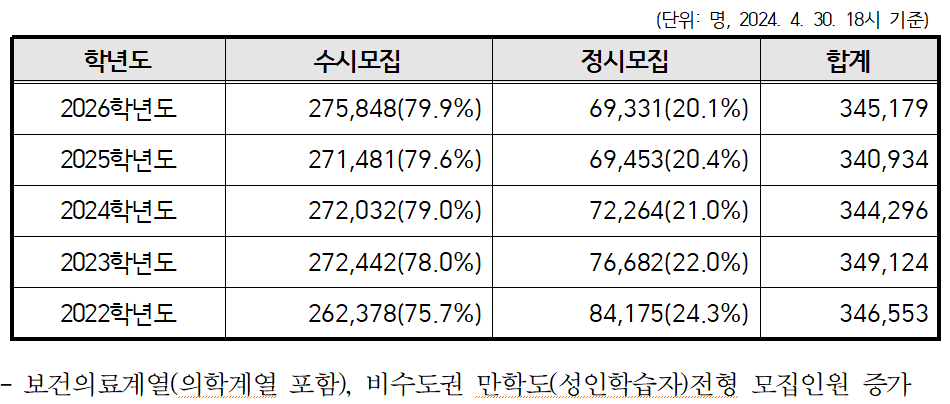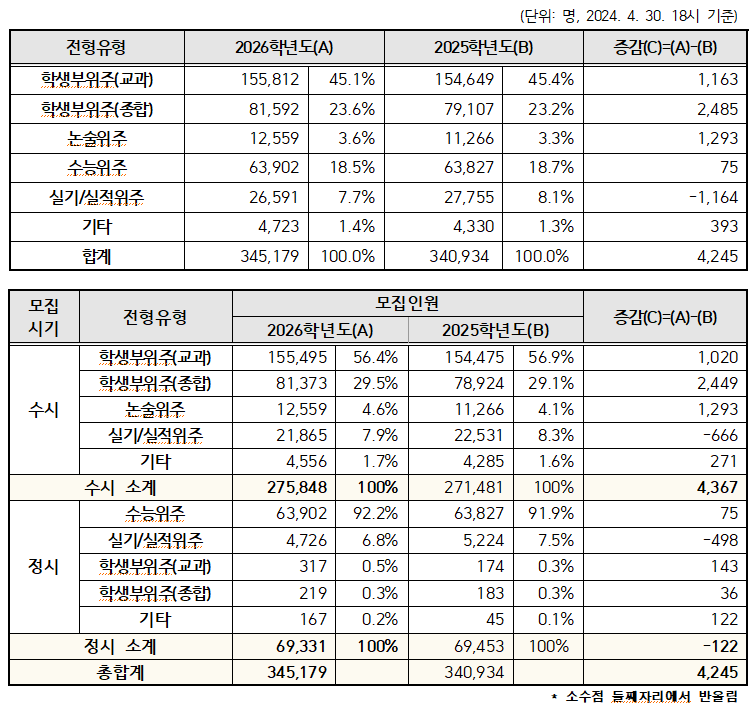 이번에 발표된 2026학년도 대학입학전형시행계획에 따르면, 전체 모집인원은 2025학년도 대비 4,245명 증가한 345,179명이다.