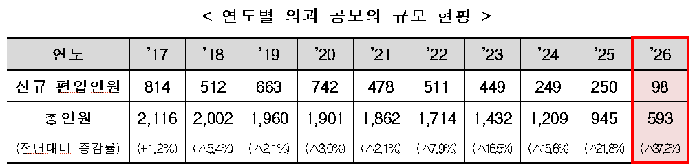 올해 복무를 마치는 의과 공보의는 450명인데 반해 신규 충원율은 22%에 머문다. 이에 따라 전체 의과 공보의 규모는 지난해 945명에서 올해 593명으로 감소했다. 2017년 2116명과 비교하면 10년 사이 4분의 1 수준으로 줄어든 셈이다.
