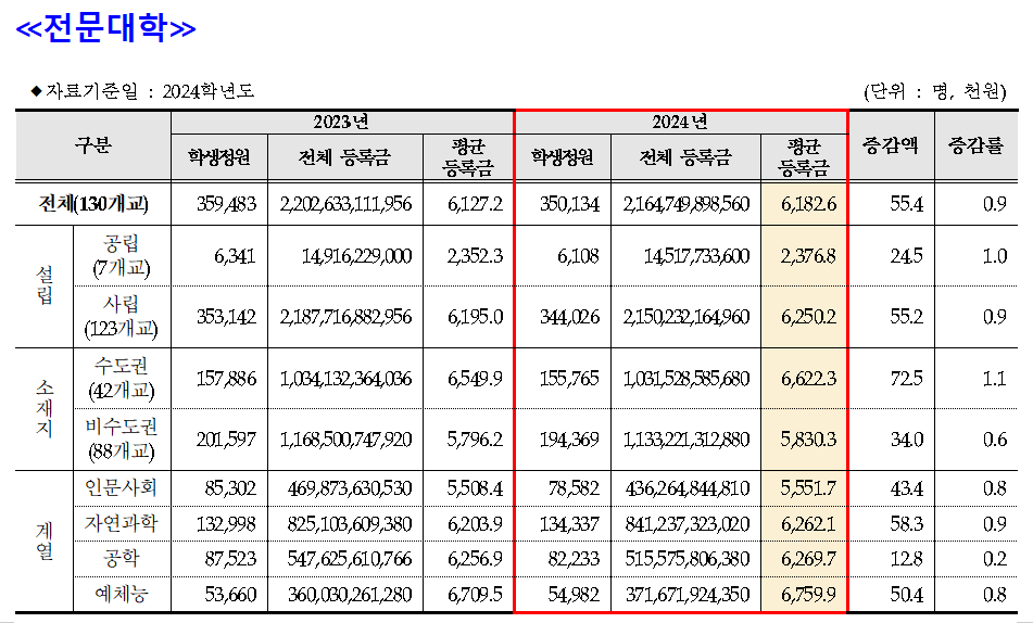 사립 전문대 평균등록금은 625만2백 원, 공립은 237만6천8백 원이고, 수도권은 662만2천3백 원, 비수도권은 583만3백 원인 것으로 집계됐다.
