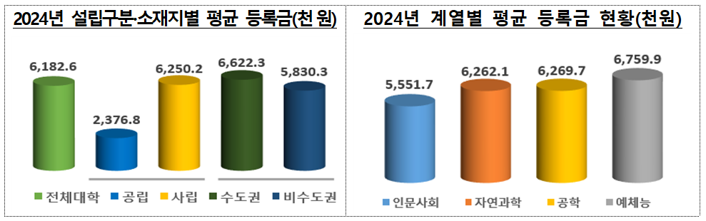 계열별로는 의학계열이 평균등록금 984만3천4백 원으로 가장 높았고, 예체능 782만8천2백 원, 공학 727만7천2백 원, 자연과학 687만5천5백 원, 인문사회 600만3천8백 원 순으로 나타났다.