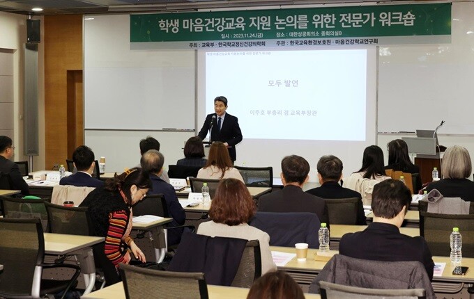 <이주호 부총리 겸 교육부장관은 2023년 11월 24일(금), 대한상공회의소에서 열리는 학생 마음건강교육 지원 논의를 위한 전문가 워크숍에 참석했다. 사진=교육부>