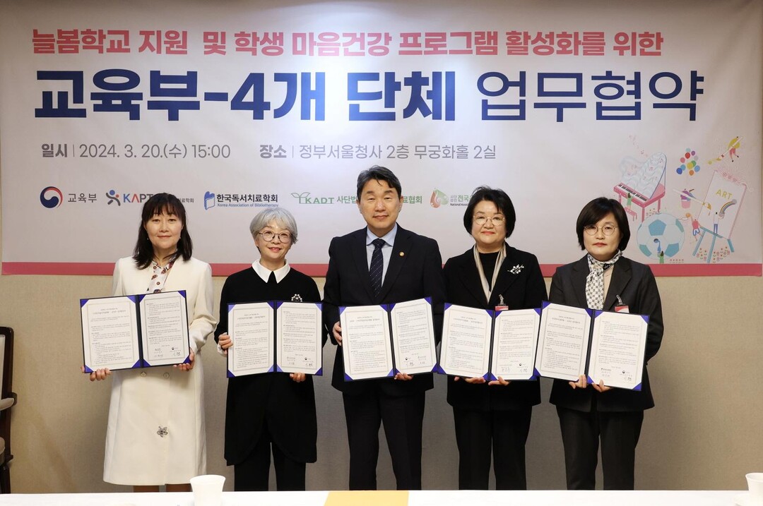 [피앤피뉴스=마성배 기자] 교육부(부총리 겸 교육부장관 이주호)는 20일 서울청사에서 4개 민간단체와 늘봄학교 심리정서 치유 프로그램 제공을 위한 업무협약을 체결했다고 밝혔다.