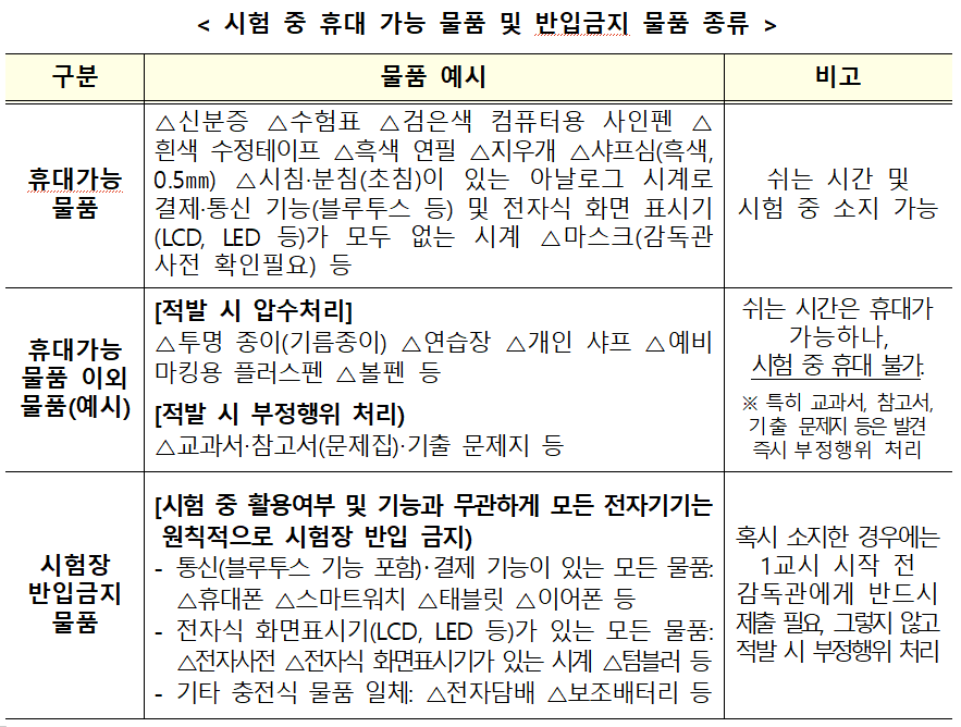 올해 역시 휴대전화 등 모든 전자기기 반입이 전면 금지된다. 전자기기를 소지한 사실만으로도, 기기 전원이 꺼져 있거나 가방 속에 있어도 부정행위로 간주되며 해당 시험 전 과목 무효 처리된다. 다만, 통신·결제 기능이 없는 아날로그 시계(시·분·초침 표시)만 착용할 수 있다.