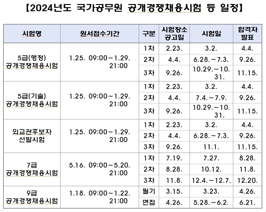 인사혁신처(처장 김승호)는 5·7·9급 및 외교관후보자 선발시험 등 ‘2024년도 국가공무원 공개경쟁채용시험 등 일정’을 사이버국가고시센터(www.gosi.kr)를 통해 8일(오늘) 공개한다고 밝혔다.