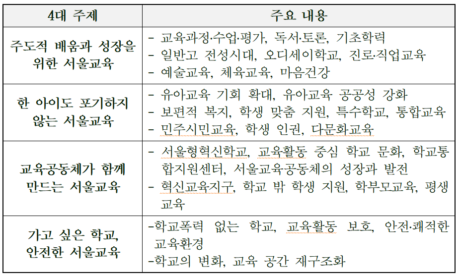 지속가능한 서울교육을 위해 ▲학교 현장의 자발성과 다양함 지원 ▲교육 불평등 해소를 위한 '정의로운 차등' 강화 ▲다양한 배움을 지원하고 스스로 학습할 수 있는 여건 조성 ▲대입제도와 대학서열화 체제 개혁 등 네 가지 주요 과제를 제시했다.
