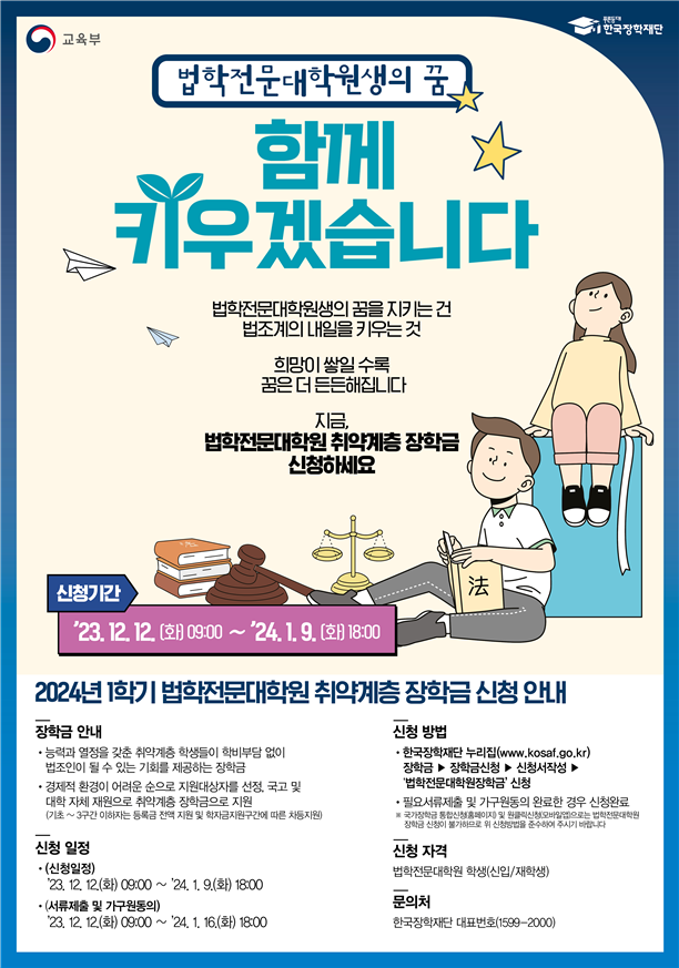 12일부터 2024년 1월 9일까지 신청기간이며, 법학전문대학원 신입생(입학예정자) 및 재학생으로 재단누리집(https://www.kosaf.go.kr)에서 24시간 신청할 수 있다.