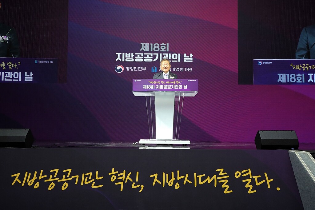 <이상민 행정안전부 장관이 2023년 9월 22일 부산항국제전시컨벤션센터에서 열린 '제18회 지방공공기관의 날 기념식'에 참석해 기념사를 하고 있다. 사진=행정안전부>