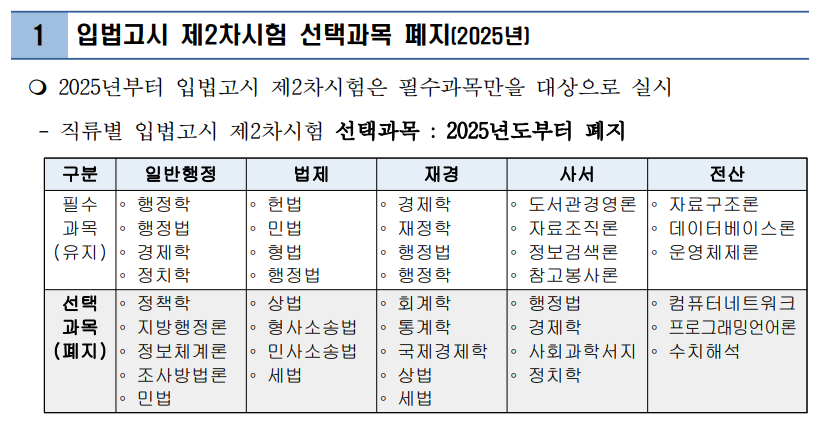 한편, 2025년부터 입법고시 2차 시험은 필수과목만 유지하고 선택과목은 전면 폐지될 예정이다.