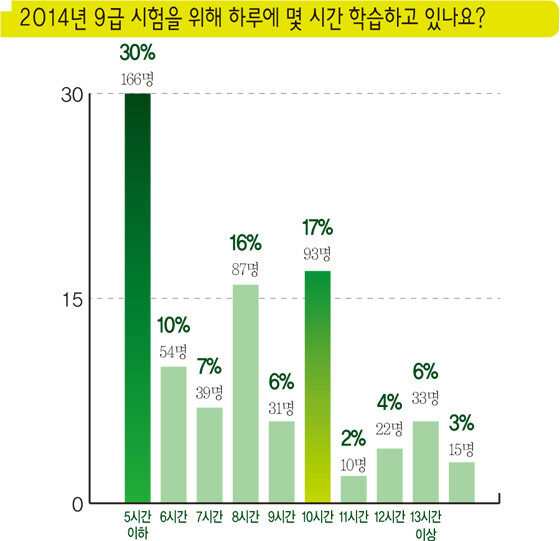 내년도 9급 공무원시험을 준비하는 수험생 10명 중 3명은 10시간 이상을 책과 씨름하는 것으로 조사됐다. ‘2014년 9급 시험을 위해 하루에 몇 시간 학습하고 있나요?’라는 설문에 응답자의 29%가 10시간 이상이라고 답하였다.
