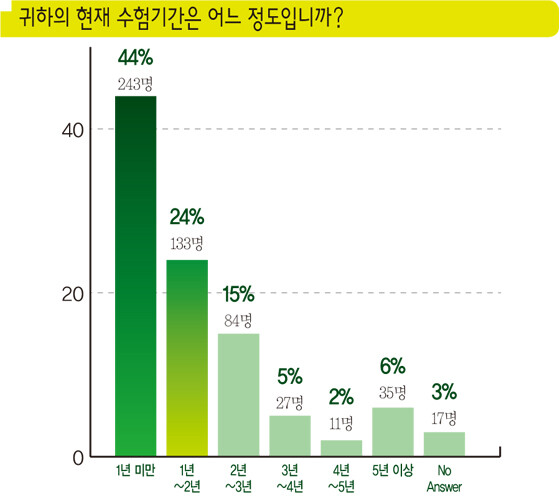 반면 실제 수험생들의 수험기간을 묻는 질문에는 44%(243명)가 1년 미만이라고 답하였다. 이 밖에 1~2년 24%(133명), 2~3년 15%(84명), 3~4년 5%(27명), 4~5년 2%(11명)으로 나타났으며, 5년 이상이라고 응답한 수험생도 6%(35명)로 확인되었다.