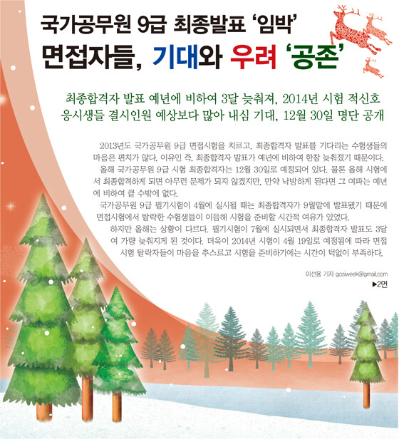 2013년도 국가공무원 9급 면접시험을 치르고, 최종합격자 발표를 기다리는 수험생들의 마음은 편치가 않다. 이유인 즉, 최종합격자 발표가 예년에 비하여 한참 늦춰졌기 때문이다.