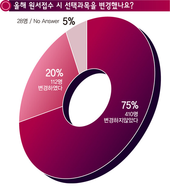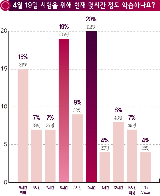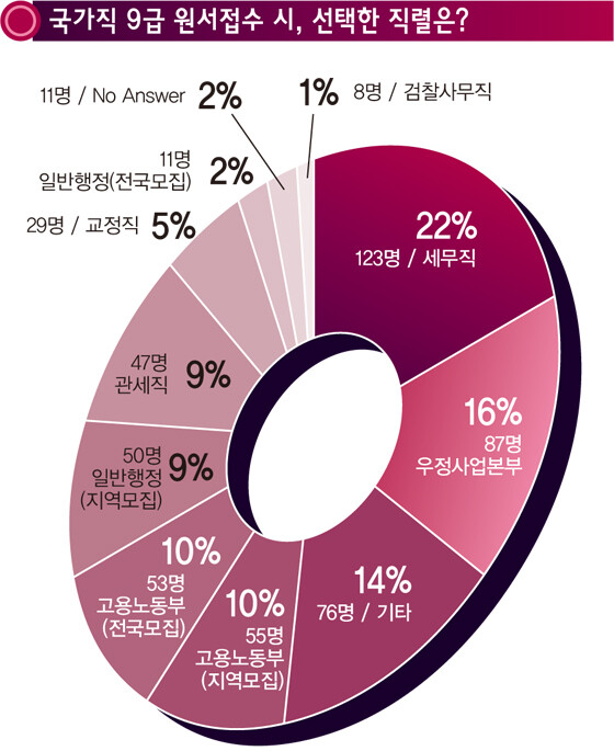 130218_43_6 “이제 모든 선택은 끝났다.” 2014년 국가공무원 9급 공채 시험 원서접수가 지난 7일 마감된 가운데 수험생들은 ‘60일의 기적’을 꿈꾸며, 오늘도 시험 준비에 열중하고 있다. 특히 올해 시험에서 최대 변수로 꼽히고 있는 세무직 대규모 채용으로 인하여 수험생들은 원서접수 마지막까지 계산기를 두드리며 신중한 모습을 보였던 것으로 전해지고 있다. 이에 ‘공무원수험신문’과 수험커뮤니티 ‘9꿈사’에서는 ‘2014년 국가공무원 9급 공채 시험 원서접수’의 전반적인 현황을 알아보기 위한 설문조사를 진행하였다. 이번 설문조사에서는 수험생들의 직렬선택을 비롯하여 선택과목과 평균 학습시간, 수험기간, 주요 학습패턴 등에 대해여 알아보았다.   ■유혹의 손길 세무직, 10명 중 2명 ‘선택’ 올해 국가공무원 9급 공채 시험의 최대 화두로 떠오른 세무직에 대한 수험생들의 관심이 높은 것으로 나타났다. ‘국가직 9급 원서접수 시, 귀하가 선택한 직렬은?’이란 설문에 ‘세무직’이라고 응답한 인원은 22%(123명)으로 나타났다.130218_43_6-1   이어 우정사업본부 16%(87명), 고용노동부(지역모집) 10%(55명), 고용노동부(전국모집) 10%(53명), 일반행정(지역모집) 9%(50명), 관세직 9%(47명), 교정직 5%(29명), 일반행정(전국모집) 2%(11명), 검찰사무직 1%(8명) 순으로 집계됐다. 특히 설문에 참여한 수험생 10명 중 6명 이상(65%)은 올해 세무직 대규모 채용이 타 직렬의 경쟁률에 영향을 미칠 것으로 전망했다. 또 수험생들이 직렬을 선택함에 있어 가장 고려했던 부분은 합격선(28%)인 것으로 조사됐다. 이어 선발인원(19%)과 본인의 적성(17%) 등을 고려했다는 수험생들도 높은 비율을 보이고 있었다.   ■선택과목은 ‘사회’…53% 고교이수교과목 도입 2년째를 맞는 올해 시험에서 수험생들은 ‘사회’를 가장 많이 선택한 것으로 조사됐다. ‘귀하는 어떤 과목을 선택과목으로 선택했나요?(2개 복수 선택)’란 물음에 응답자의 53%(289명)가 ‘사회’라고 답하였다. 이는 본지가 지난 11월말에 실시한 ‘2014년 국가공무원 9급 준비 현황’ 설문조사와 큰 차이를 보였다. 당시에는 응답자의 41%가 ‘행정법총론’을 선택하여 가장 많았고, 이어 행정학개론 34%, 사회 25% 순이었다. 130218_43_6-2 하지만 이번 설문조사에서는 사회를 선택했다는 응답자가 53%(289명)으로 가장 많았고, 이어 행정학개론 46%(252명), 행정법총론 44%(242명), 수학 11%(62명), 과학 9%(47명), 세법 5%(26명), 회계학 26%(26명) 등이었다.   ■수험생 20%는 선택과목 ‘변경’ 130218_43_6-3 올해 시험을 앞두고 수험생 20%는 선택과목을 변경한 것으로 나타났다. ‘귀하는 올해 원서접수 시 선택과목을 변경했나요?’라는 설문에 응답자의 20%(112명)이 ‘변경하였다’고 답하였다. 즉 수험생 10명 중 2명은 선택과목을 변경한 것이다. 반면 ‘선택과목을 변경하지 않았다’고 응답한 수험생은 75%(410명)으로 집계됐다. 수험생들의 선택과목 변경은 세무직 대규모 채용이 일정부분 영향을 미친 것으로 분석되고 있다. 실제로 수험생들의 선택과목 설문에서 확인할 수 있듯이 사회 과목을 선택 비중이 지난해보다 높아진 점에서 확인할 수 있었다.   ■수험생 39%, 하루 10시간 이상 학습 4월 19일 실시되는 국가공무원 9급 공채 시험을 위해 수험생 10명 가운데 4명은 10시간 이상 학습하고 있는 것으로 나타났다. 130218_43_6-4 ‘귀하는 4월 19일 시험을 위해 현재 몇 시간 정도 학습하나요?’란 설문에 응답자의 39%가 10시간 이상이라고 응답하였다. 학습시간별로는 ▲5시간 이하 15%(81명) ▲6시간 7%(39명) ▲7시간 7%(37명) ▲8시간 19%(105명) ▲9시간 9%(52명) ▲10시간 20%(112명) ▲11시간 4%(20명) ▲12시간 8%(43명) ▲13시간 이상 7%(39명) 등이었다. 또 올해 시험을 위해 수험생들은 현재 문제풀이 위주(32%)의 학습을 가장 많이 하고 있었으며, 여러 가지 병행과 기본서 위주의 학습패턴은 각각 31%와 25%로 집계됐다. 이밖에 중요 쟁점을 암기하고 있다고 답한 수험생은 전체 6%(32명)에 불과하였다.   ■수험생들, 공통과목에 집중한다? 금년도 국가공무원 9급 공채 시험 합격을 위해 수험생들이 가장 많은 시간을 투자하는 과목은 영어로 확인됐다. 130218_43_6-5 ‘현재 귀하가 가장 많은 시간을 투자하는 과목은?’이란 설문에 응답자의 49%(269명)가 영어 과목이라도 답하였다. 이어 한국사에 가장 많은 시간을 투자한다는 수험생은 19%(102명)였으며, 국어가 7%(38명)로 그 뒤를 이었다. 설문조사 결과에서 확인할 수 있듯이 수험생 75%는 선택과목보다는 공통과목(국어, 영어, 한국사) 학습에 치중하고 있었다. 반면 선택과목에 많은 시간을 투자하고 있다는 수험생들의 경우 행정법총론 5%, 행정학개론 5%, 사회 4%, 수학 1% 순으로 나타났다. 한편, 이번 설문조사에 참여한 수험생들의 수험기간은 ‘1년 미만’ 34%(186명), ‘1년 이상~2년 미만’ 28%(154명), ‘2년 이상~3년 미만’ 18%(98명), ‘3년 이상~4년 미만’ 6%(34명), ‘4년 이상~5년 미만’ 2%(13명), ‘5년 이상’ 8% 등이었다.