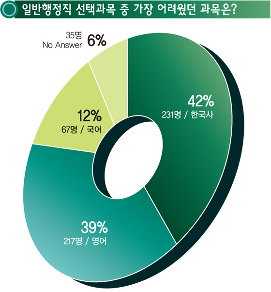 또 올해 시험의 전체 난이도에 대해 응답자의 61%는 ‘어려웠다(상)’고 답하였고, 공통과목 중에서는 한국사(42%)가, 선택과목 중에서는 행정법총론(33%)에 진땀을 흘렸다고 답하였다.