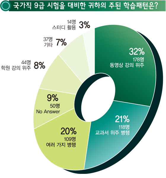 이밖에 여러 가지 병행 20%(109명), 학원 강의 위주 8%(44명), 스터디 활용 3%(14명) 순으로 나타났다.