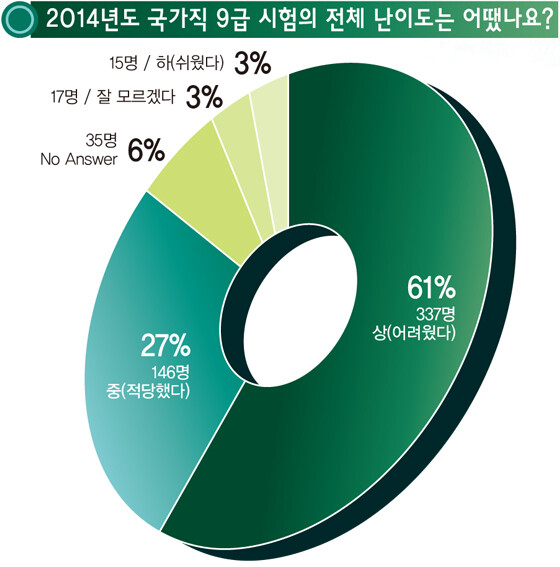 2014년도 국가공무원 9급 공채 시험에 응시한 수험생들은 이번 시험의 난이도에 대해 어떻게 생각하고 있을까? 본지가 진행한 설문조사 결과 응답자의 61%(337명)는 ‘어렵다(상)’에, 27%(146명)은 ‘중(적당했다)’이라고 응답하였다.